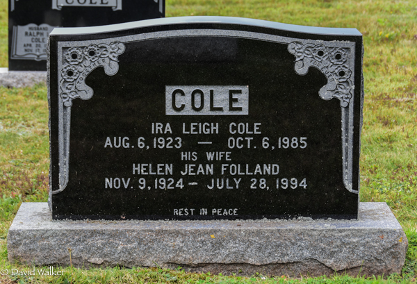 Inscription: COLE / Ira Leigh Cole / Aug. 6, 1923 - Oct. 6, 1985 / His Wife / Helen Jean Folland / Nov. 9, 1924 - July 28, 1994 / Rest in Peace.2,3  Cemetery Marker: Ira Leigh Cole (1923-1985), his wife Helen Jean Folland (1924-1994). St. Thomas Anglican Church Cemetery, Springbrook, Queens County, Prince Edward Island, Canada.