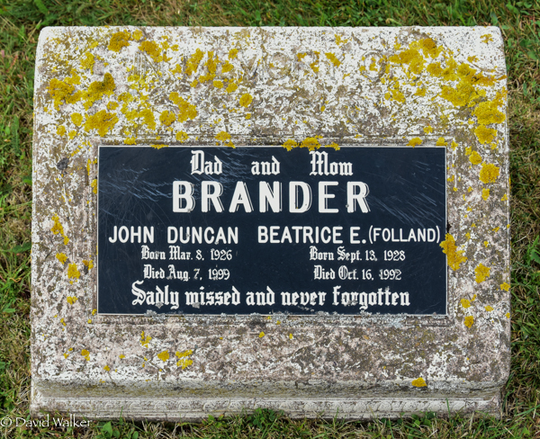- [S14360] Cemetery marker, Peoples Cemetery, Malpeque, Prince County, Prince Edward Island, Canada. John Duncan Brander & Beatrice Esther Folland, tombstone inscription & photograph; documented by David A. Walker, 4 September 2019.