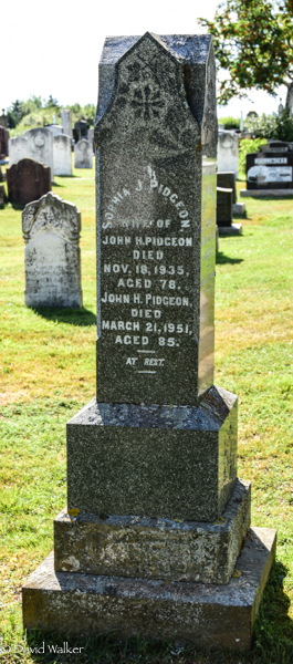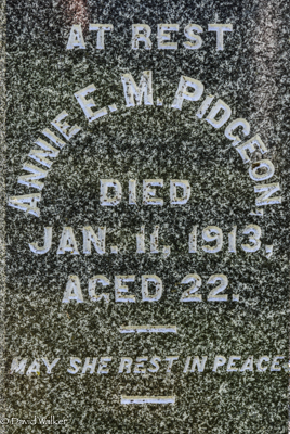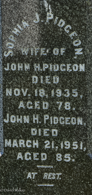 Inscription: Sophia Pidgeon / Wife of / John H. Pidgeon / Died / Nov. 18, 1935, / Aged 78. / John H. Pidgeon / Died / March 21, 1951 / Aged 85. / -- / At RestRight: At Rest / Annie E. M. Pidgeon / Died / Jan. 11, 1913, / Aged 22. / -- / May She Rest in Peace.2,3  Cemetery Marker: John H. Pidgeon (c1862-1951), his wife Sophia J. Paynter (c1857-1935), their daughter Annie Pidgeon (1890-1913). St. Thomas Anglican Church Cemetery, Springbrook, Queens County, Prince Edward Island, Canada.  Front inscription detail.  Right inscription detail.