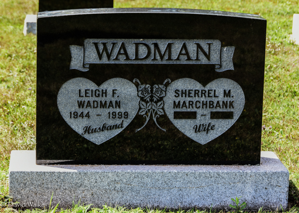 Inscription: WADMAN / Leigh F. / Wadman / 1944 - 1999 / Husband | Sherrel M. / Marchbank /.3,2  Cemetery Marker: Leigh F. Wadman (1944-1999), his wife Sherrel M. Marchbank ( - ). Peoples Cemetery, Kensington, Prince County, Prince Edward Island, Canada.