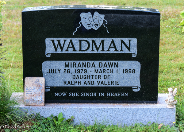 Inscription: WADMAN / Miranda Dawn / July 26, 1979 - March 1, 1998 / Daughter of / Ralph and Valerie / Now She Sings in Heaven.2,3  Cemetery Marker: Miranda Dawn Wadman (1979-1998). Peoples Cemetery, Kensington, Prince County, Prince Edward Island, Canada.