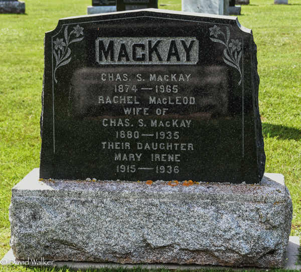Inscription: MACKAY / Chas. S. MacKay / 1874 - 1965 / Rachel MacLeod / Wife of / Chas. S. MacKay / 1880 - 1935 / Their Daughter / Mary Irene / 1915 - 1936.1,2  Marker, Charles S. MacKay (1874-1965), his wife Rachel MacLeod (1880-1935), their daughter Mary Irene MacKay (1915-1936). Geddie Memorial Cemetery, Springbrook, Queens County, Prince Edward Island, Canada.
