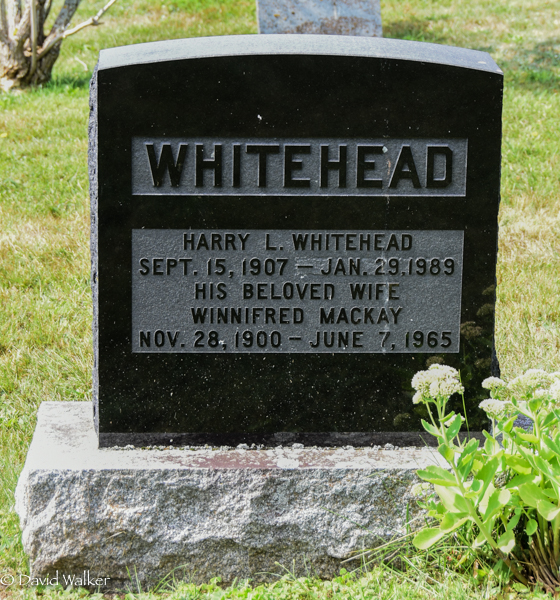 Inscription: WHITEHEAD / Harry L. Whitehead / Sept. 15, 1907 - Jan. 29, 1989 / His Beloved Wife / Winnifred MacKay / Nov. 28, 1900 - June 7, 1965.1,2  Cemetery Marker: Harry L. Whitehead (1907-1989), his wife Winnifred MacKay 91900-1965). Peoples (Protestant) Cemetery, New London, Queens County, Prince Edward Island, Canada.