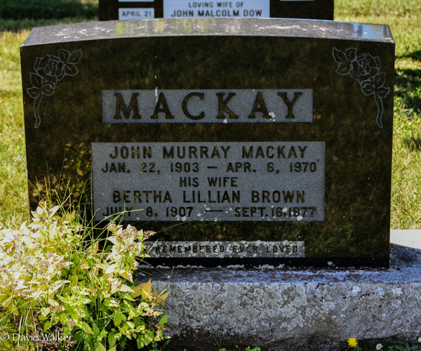 Inscription: MACKAY / John Murray MacKay / Jan. 22, 1903 - Apr. 6, 1970 / His Wife / Bertha Lillian Brown / July 8, 1907 - Sept. 16, 1977 / Ever Remembered Ever Loved.2,3  Cemetery Marker: John Murray MacKay (1903-1970), his wife Bertha Lillian Brown (1907-1977). Peoples (Protestant) Cemetery, New London, Queens County, Prince Edward Island, Canada.