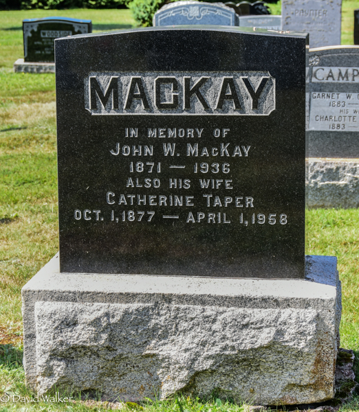 Inscription: MACKAY / In Memory of / John W. MacKay / 1871 - 1936 / Also His Wife / Catherine Taper / Oct. 1, 1877 - April 1, 1958.2,3  Cemetery Marker: John W. MacKay (1871-1936), his wife Catherine Taper (1877-1958). Peoples (Protestant) Cemetery, New London, Queens County, Prince Edward Island, Canada.