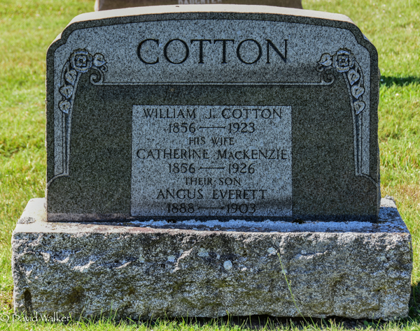 Inscription: COTTON / William J. Cotton / 1856 - 1923 / His Wife / Catherine MacKenzie / 1856 - 1926 / Their Son / Angus Everett / 1888 - 1903.1,2  Cemetery Marker: William J. Cotton (1856-1923), his wife Catherine MacKenzie (1856-1926), their son Angus Everett (1888-1903). Peoples (Protestant) Cemetery, New London, Queens County, Prince Edward Island, Canada.