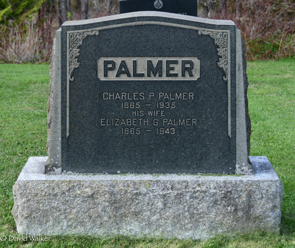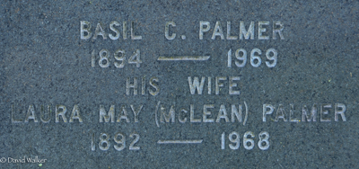 Inscription: PALMER / Charles P. Palmer / 1865 - 1935) / His Wife / Elizabeth G. Palmer / 1865 - 1943Back:Basil C. Palmer / 1894 - 1969 / His Wife / Laura May (McLean) Palmer / 1892 - 1968.1  Tombstone, Charles P. Palmer (1865-1935), his wife Elizabeth G. Gray (1865-1943), their son Basil C. Palmer (1894-1969), his wife Laura May McLean (1892-1968). United Baptist Church Cemetery, Waterville, Carleton County, New Brunswick, Canada.  Back inscription.
