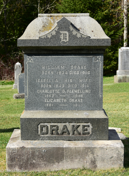 Inscription: William Drake / Born 1834 Died 1916 / Isabella His Wife / Born 1843 Died 1914 / Charlotte D. Flewelling / 1862 - 1939 / Elizabeth Drake / 1861 - 1948 / DRAKELeft:Laura B. Black / 1867 - 1922Right:B.C. Drake / 1879 - 1928 / His Wife / Elizabeth / 1884 - 1971.1  Tombstone, William Drake (1834-1916), his wife Isabella Walton (1843-1914), their children, Charlotte (1862-1939), Elizabeth (1861-1948), Laura (1867-1922) and Banford Coleman (1879-1928), his wife Elizabeth (1884-1971). United Baptist Church Cemetery, Waterville, Carleton County, New Brunswick, Canada.  Left inscription.  Right inscription.