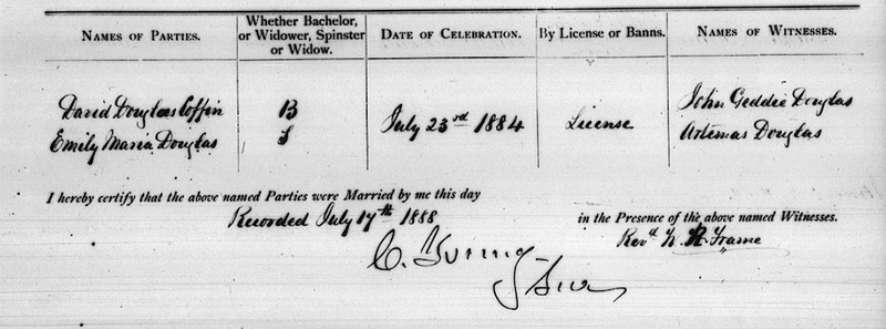 | Marriage | He married Janet Coffin daughter of William Kemble Coffin and Margaret Dingwall, on 15 February 1832, in Savage Harbour, Kings County, Prince Edward IslandG.2 |