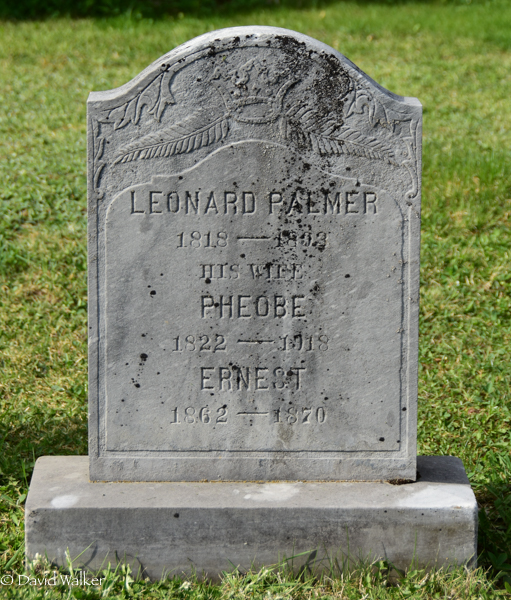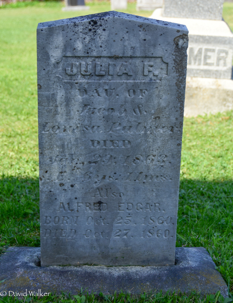 Inscription: Julia F. / Dau. of / Jacob & / Louisa Palmer / Died / Jan. 29, 1863 / Æ. 6 ys. 11 ms. / Also / Alfred Edgar / Born Oct. 25, 1860, / Died Oct. 27, 1860.1  Tombstone, Julia F. Palmer (1856-1863), her brother Alfred Edgar Palmer (1860-1860). United Baptist Church Cemetery, Waterville, Carleton County, New Brunswick, Canada.