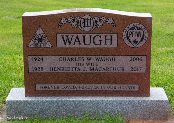 Inscription: WAUGH / 1924 - Charles W. Waugh 2006 / His Wife / 1928 Henrietta J. MacArthur 2017.1  Cemetery marker, Charles W. Waugh (1924-2006), his wife Henrietta J. MacArthur (1928-2017). United Baptist Cemetery, Central Bedeque, Prince County, Prince Edward Island, Canada.