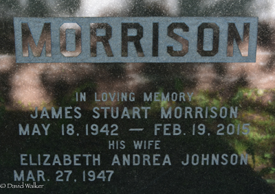 Inscription: MORRISON / James Arthur Morrison (June 9, 1908 - May 10, 1970) / His Wife / Florence Grace Morris / Feb. 28, 1907 - Aug. 7, 1990 / Arthur Donald Morrison / Sept. 29, 1939 - July 29, 1959Back:MORRISON / In Loving Memory / James Stuart Morrison / May 18, 1942 - Feb. 19, 2015 / His Wife / Elizabeth Andrea Johnson / Mar. 27, 1947 -.2,1  Cemetery marker, James Arthur Morrison (1908-1970), his wife Florence Grace Morris (1907-1990), their son James Stuart Morrison (1942-2015), his wife Elizabeth Andrea Johnson (1947- ). Peoples Cemetery, Summerside, Prince County, Prince Edward Island, Canada.  Back inscription detail.