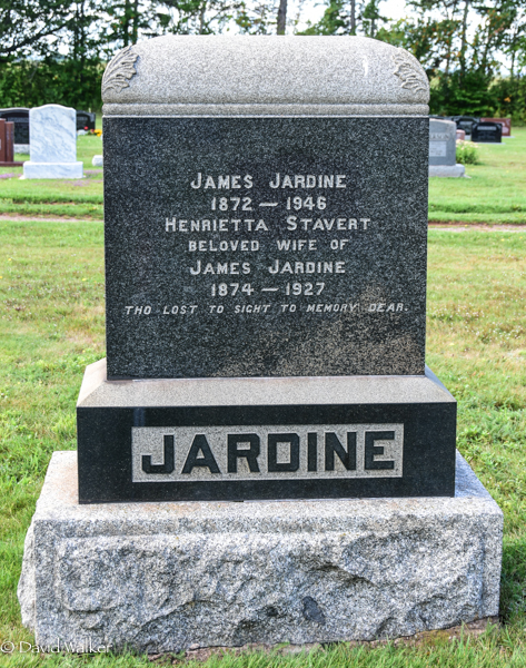 - [S14518] Cemetery marker, Peoples Cemetery, Kensington, Prince County, Prince Edward Island, Canada. James Jardine & Henrietta Stavert, tombstone inscription & photograph; documented by David A. Walker, 31 August 2019.