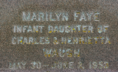 Inscription: WAUGH / 1896 John W. Waugh 1965 / 1898 Vera C. Campbell 1944 / Wife of / J. W. WaughBack:Marilyn Faye / Infant daughter of / Charles & Henrietta / Waugh / May 30 - June 2, 1953.1  Cemetery marker, John Wilber Waugh (1896-1965), his wife Vera C. Campbell (1898-1944), their granddaughter Marilyn Faye Waugh (1953-1953). United Baptist Cemetery, Central Bedeque, Prince County, Prince Edward Island, Canada.  Back inscription detail.