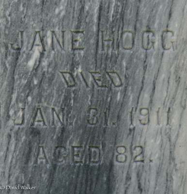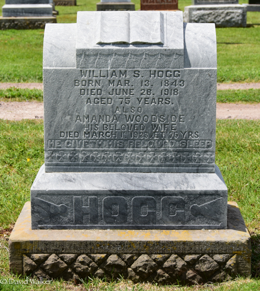 Inscription: William S. Hogg / Born Mar. 13, 1843 / Died June 28, 1918 / Aged 75 Years / Also / Amanda Woodside / His Beloved Wife / Died March 1rst1923 ÆT. 76 Yrs. / He Giveth His Beloved Sleep / HOGG/ Right: Jane Hogg / Died / Jan. 31, 1911 / Aged 82.2,1  Cemetery marker, William S. Hogg (1843-1918), his wife Amanda Woodside (1847-1923), his sister Jane Hogg (c1829-1911). Peoples Cemetery, Kensington, Prince County, Prince Edward Island, Canada.  Right inscription detail.