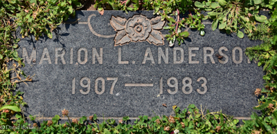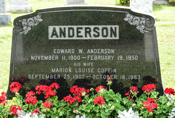Inscription: ANDERSON / Edward W. Anderson / November 11, 1900 - February 19, 1950 / His Wife / Marion Louise Coffin / September 25, 1907 - October 18, 1983.1,2  Tombstone, Edward W. Anderson (1900-1950), his wife Marion Louise Coffin (1907-1983). Presbyterian/United Cemetery, Midgell, Kings County, Prince Edward Island, Canada.  flatstone for Edward Anderson.  flatstone for Marion (Coffin) Anderson.
