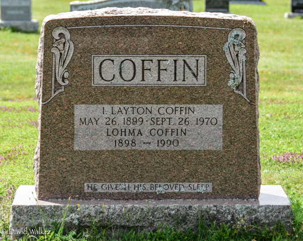 Inscription: COFFIN / I. Layton Coffin / May 26, 1889 - Sept. 26, 1970 / Lohma Coffin / 1898 - 1990 / He Giveth His Beloved Sleep.4,5  Tombstone, Isaac 'Layton' Coffin (1899-1970), his wife Lohma Coffin (1898-1990). Presbyterian/United Cemetery, Midgell, Kings County, Prince Edward Island, Canada.