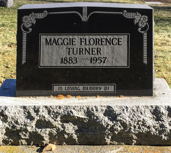Inscription Front: Maggie Florence / Turner / 1883 - 1957.5  Marker, Maggie Florence (Crozier) Turner (1883-1957). Queens Park Cemetery & Mausoleum, Calgary, Alberta, Canada. Photo courtesy of findagrave.com.