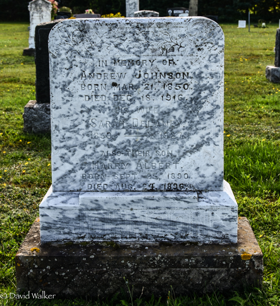 Inscription: In Memory of / Andrew Johnson / Born Mar. 21, 1850, / Died Dec. 18, 1916. / His Wife / Sarah Delaney / 1850 - 1927 / Also Their Son / Harry Albert / Born Sept. 25, 1890, / Died Aug. 24, 1896.Back: Their Daughter / Selina L. / Nov. 21, 1897. / Feb. 7, 1966.2,1  Cemetery Marker: Andrew Johnson (1850-1916), his wife Sarah Delaney (1859-1927), their children Harry Albert (1890-1896) and Seleina L. (1897-1966). United Church Cemetery, Margate, Prince County, Prince Edward Island, Canada.  Back inscription detail.