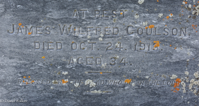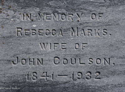Inscription: At Rest / James Wilfred Coulson / Died Oct. 24, 1913, / Aged 34. / COULSONBack: In Memory of / Rebecca Marks / Wife of / John Coulson, / 1841 - 1932.1  Cemetery Marker: James Wilfred Coulson (c1879-1913), his mother Rebecca Marks (1841-1932). St. Thomas Anglican Church Cemetery, Springbrook, Queens County, Prince Edward Island, Canada.  Front inscription detail.  Back inscription detail.