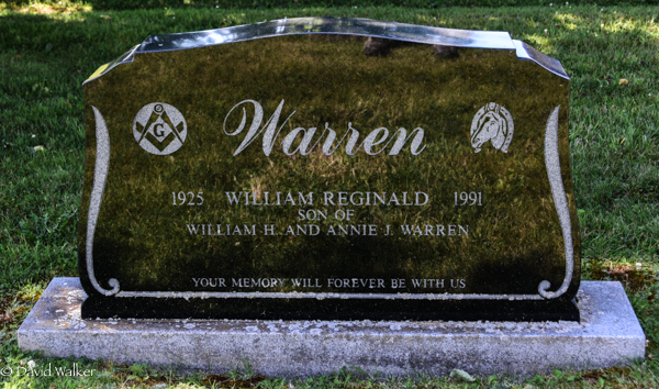 Inscription: WARREN / 1925 William Reginald 1991 / Son of / William H. & Annie J. Warren / Your Memory Will Be Forever With Us.1  Cemetery Marker: William Reginald Warren (1925-1991). Peoples (Protestant) Cemetery, New London, Queens County, Prince Edward Island, Canada.