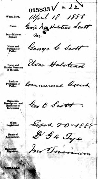 - [S15358] Birth Record, Walter Cavil Scott entry, digital copy of original document Ontario, Canada Births, 1858-1913. Archives of Ontario, Toronto, Ontario, Canada. Registrations of Births and Stillbirths - 1869-1913. Series MS933, Reel 27, Record Group RG 80-2, Archives of Ontario,, Toronto,, Ontario, Canada.