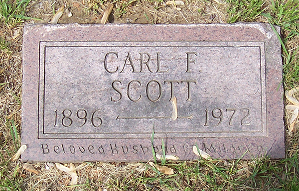 Inscription Front: Carl F. / Scott / 1896 - 1972.8  Marker, Carlton Frederick Scott (1896-1972). Greenhill Cemetery, Kingsville, Essex County, Ontario, Canada. Photo courtesy of Smith Favaro (findagrave,com).