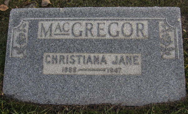 Inscription Front: MacGREGOR / Christiana Jane / 1869 - 1947.2  Marker, Christiana Jane Watkinson (1869-1947). Burnsland Cemetery, Calgary, Alberta, Canada. Photo courtesy of findagrave.com.