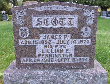 Inscription Front: SCOTT / James. / Aug. 15, 1892 -- July 14, 1970 / His Wife / Lillian E. / Pennington / Apr. 24, 1908 -- Sept. 9, 1974.6  Marker, James Paul Scott (1892-1970), his wife Lillian E. Pennington (1908-1974). Evergreen Cemetery, West Lorne, Elgin County, Ontario, Canada. Photo courtesy of Thomas Brown (findagrave.com).