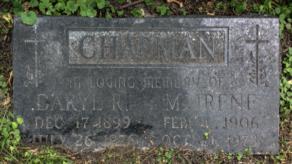 Inscription Front: CHAPMAN / In Loving Memory of / Daryl R. / Dec. 17 1899 / July 26 1976 | M. Irene / Feb. 4 1906 / Oct. 21 1973.9  Marker, Daryl Rayworth Chapman (1899-1976), his wife, Marguerite Irene Watt (1906-1973). Elmwood Cemetery, Winnipeg, Manitoba, Canada. Photo courtesy of findagrave.com, Memorial ID 122650197.