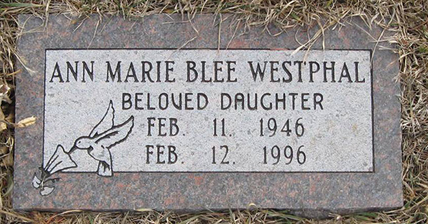 Inscription: Ann Marie Blee Westphal / Feb. 11, 1946 / Feb. 12, 1996.5  Marker, Ann Marie (Blee) Westphal (1946-1996). Highland Cemetery, Great Falls, Cascade County, Montana, U.S.A. Photo courtesy of findagrave.