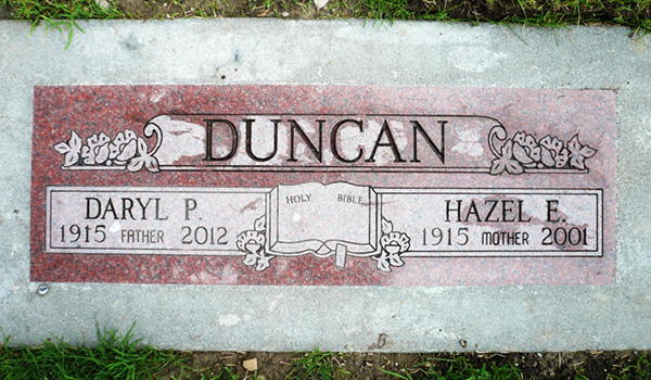 Inscription: DUNCAN / Daryl P. / 1915 Father 2012 | Hazel E. / 1915 Mother 2001.1,6  Marker, Daryl Paul Duncan (1915-2012), his wife Hazel E. Liljemark (1915-2001). Grand View Cemetery, Anacortes, Skagit County, Washington. Photo courtesy of findagrave.com.