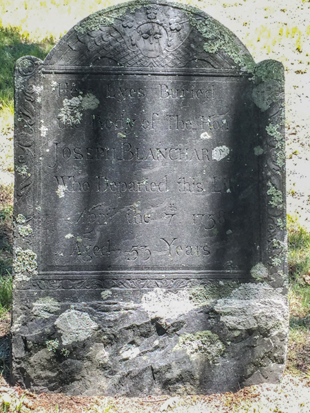 Inscription Front: Here Lyes Buried / the Body of The Hon. / Joseph Blanchard / Who Departed this Life / April the 7th 1758 / Aged 53 Years.4,5  Tombstone, Joseph Blanchard (1704-1758). Old Dunstable Cemetery, Nashua, New Hampshire. Phot courtesy of findagrave.com, posted by Peter Jeffrey.