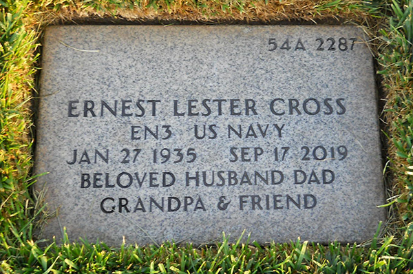 Inscription: Ernest Lester Cross / EN3 US Navy / Jan 27 1935 - Sep 17 2019 / Beloved Husband Dad / Grandpa & Friend.4  Marker, Ernest Lester Cross (1935-2019). Riverside National Cemetery, Riverside, California. Photo courtesy of findagrave.com.