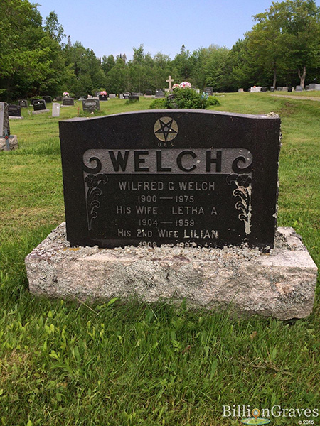 Inscription: WELCH / Wilfred G. / 1900 - 1975 / His Wife Letha A. / 1904 - 1959 / His 2nd Wife Lillian / 1906 - 1997.5  Tombstone, Wilfred G. Welch (1900-1975), his first wife Letha A. Palmer (1904-1959), his second wife Lillian Prange (1906-1977). Rural Cemetery, St. Andrews, Charlotte County, New Brunswick, Canada. Photo courtesy of Leigh Hamilton-Coombs, billiongraves.com.