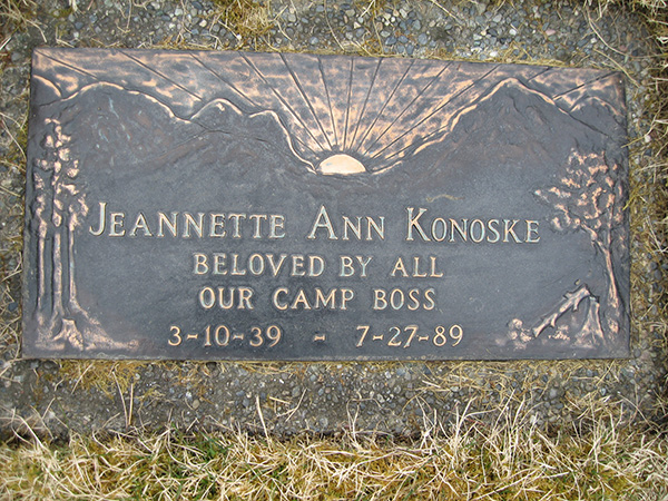 Inscription: Jeanette Ann Konoske / Beloved By All / Our Camp Boss / 3-10-39 -- 7-27-89.3  Cemetery Marker - Jeanette Anne (McLeod) Konoske. Sitka Memorial Park, Sitka, Alaska. Photo courtesy of Gary Nault, findagrave.com