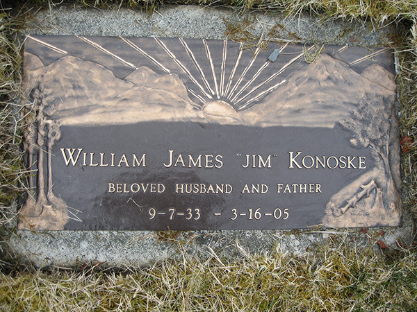 Inscription: William James "Jim" Konoske / Beloved Husband and Father / 9-7-33 -- 3-16-05.3  Cemetery Marker - William James Konoske. Sitka Memorial Park, Sitka, Alaska. Photo courtesy of Gary Nault, findagrave.com
