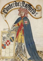 Ralph de Stafford, 1st Earl Stafford, KG. Illustration from the Bruges Book, ca. 1430. Courtesy of Wikipedia.