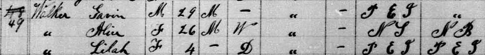 | Wife | Virginia Esther Wiggins was enumerated on the census on 4 April 1881 in the household of Thomas James Walker, as his wife, in Lot 19, Prince County, Prince Edward Island, CanadaG. Enumerated in the household with Thomas were his wife Virginia (spelled Vergeneea on the census), sons William, Warburton (spelled Warberton), John, Albert & Cecil (spelled Sesal), and daughters Laura, Minnie & Harriet (spelled Hariet).10 |