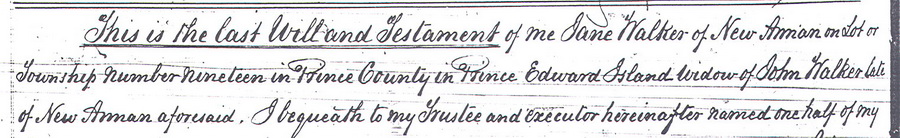 | Will | She left a will on 6 May 1887 in New Annan, Prince County, Prince Edward Island, CanadaG.8![]() Signature Jane Weir from her w ![]() Will Jane Weir part |