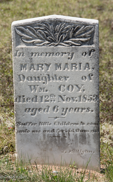 | Additional marker | There is an additional marker in the Baptist Cemetery, Upper Gagetown, Queens County, New Brunswick, Canada, 45.84576, -66.24085G. Inscription: In memory of / Mary Maria / Daughter of Wm. Coy, / died 12th Nov. 1853 / aged 6 years. / -- / Suffer little Children to come / unto me and forbid them not. / -- / [stonecutter: J. Milligun].5 ![]() This is a separate marker for Mary Maria Coy (1847-1853). |