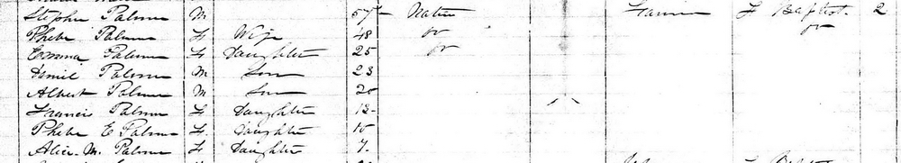| Daughter | She was enumerated on the census in 1861 in the household of Stephen Palmer, as a daughter, in Hampstead, Queens County, New Brunswick, CanadaG. included in the household with Stephen (age 57) were his wife Phebe Coy (age 48), their children Emma (age 25), Daniel (age 23), Albert (age 20), Frances (age 13), Phebe (age 10) and Alice (age 7). Stephen's occupation was listed as farmer. The family religion was Free Baptist.2 1861 Census, Hampstead, New Brunswick. Household of Stephen Palmer. Included in the household were his wife Phebe (Coy), Emma, Daniel, Albert, Frances, Phebe and Alice. Stephen's occupation was listed as farmer. The family religion was Free Baptist. |