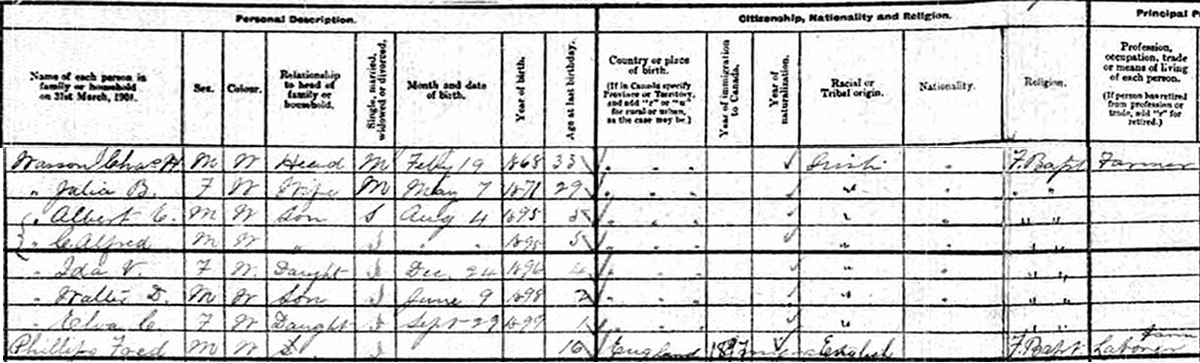 | Census | He was head of the household in the census on 1 June 1911 in Lot 19, Prince County, Prince Edward Island, CanadaG. Enumerated in the household with George were his wife Minnie, daughters Nettie, Jenny, Ella, Minnie & Louisa, and sons William, Harold & Edwin.7 |