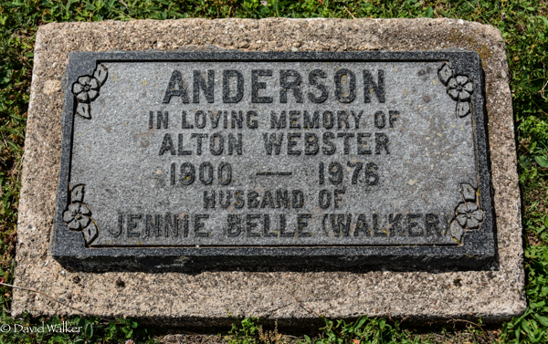 | Burial | He was buried in Midgell Cemetery, Midgell, Kings County, Prince Edward Island, Canada, 46.41470, -62.63441G. Inscription: ANDERSON / In loving memory of / Alton Webster / 1900 - 1976 / Husband of / Jennie Belle (Walker.)4 ![]() Tombstone, Alton Webster Anderson (1900-1976). Presbyterian/United Cemetery, Midgell, Kings County, Prince Edward Island, Canada. |