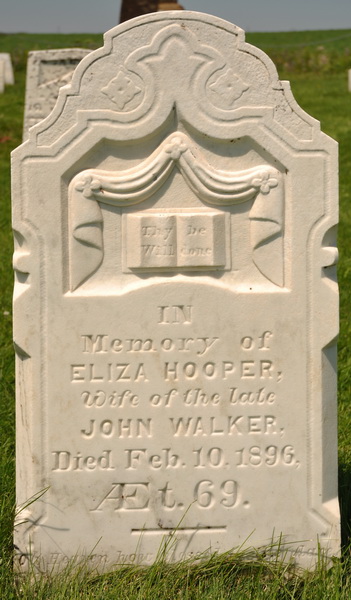 | Burial | She was buried in North Bedeque Cemetery, North Bedeque, Prince County, Prince Edward Island, Canada, 46.36158, -63.72617G. White marble ballast stone. Inscription: Thy will be done / In / Memory of / Eliza Hooper / Wife of the late / John Walker / Died Feb. 10, 1896, / AEt. 69. / Oh Heaven how blessed is the place / Where from all care set free. / No pain, no death, no sorrow there / All these prepared for thee. / Cairns Bros.1 ![]() Tombstone, Eliza Hooper (1829-1896)North Bedeque Cemetery, Prince County, Prince Edward Island, Canada. |
