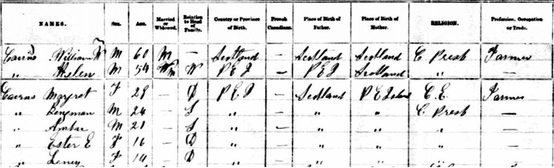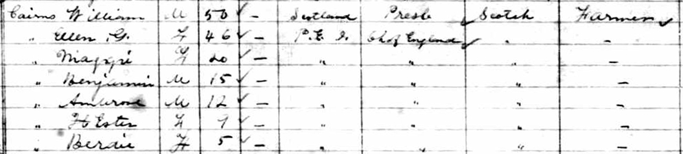| Witness | He was enumerated on the census in 1881 in the household of William Wilson Cairns in Lot 17, Prince County, Prince Edward Island, CanadaG. included in the household were William's wife Ellen/Helen (Darby), and children Maggie (age 20), Benjamin (age 15), Ambrose (age 12), Esther (age 9) and Birdie (age 5), aka Helene. William's occupation was farmer. William's religion was Presbyterian, while the remainder of the family was Church of England.5![]() 1881 Canada Census, Lot 17, Prince County, Prince Edward Island, household of William Wilson Cairns, his wife Helen/Ellen (Darby), their five children, Maggie, Benjamin, Ambrose, Esther and Birdie. |