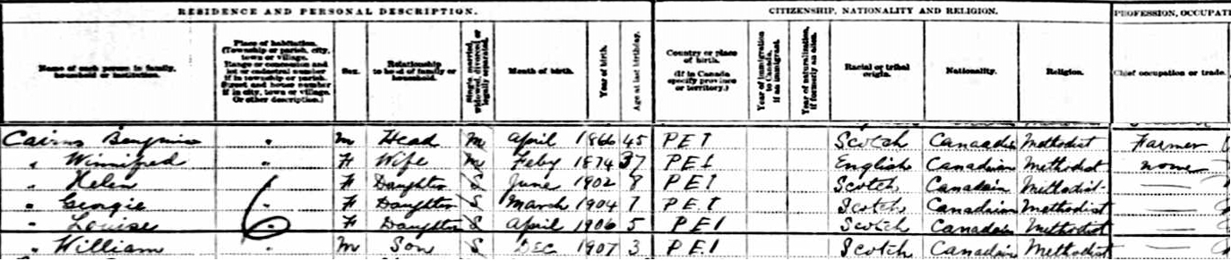 | Census | He was head of the household in the census in 1911 in Lot 19, Prince County, Prince Edward Island, CanadaG. Enumerated in the household with Benjamin (age 45) were his wife Winnifred (age 37), and their children Helen (age 8), Georgie (age 7), Louise (age 5) and William (age 3). Benjamin was a farmer. The family religion was Methodist.7![]() 1911 Canada Census, Lot 19, Prince County, Prince Edward Island. Household of Benjamin Cairns, his wife Winnifred Yeo, and their children Helen, Georgie, Louise and William. |
