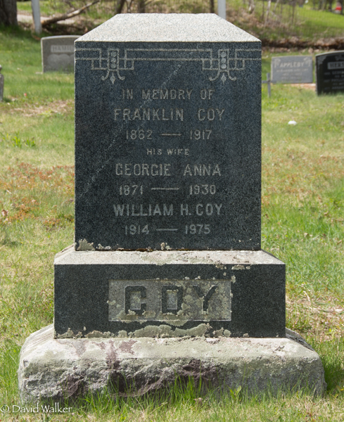 | Principal 2 | She witnessed the burial of Franklin George Coy and Georgianna Brooks in Upper Gagetown (Baptist) Cemetery, Upper Gagetown, Queens County, New Brunswick, Canada, 45.84610, -66.24145G.3![]() Tombstone, Franklin George Coy (1862-1917), his wife Georgie Anna Brooks (1871-1930), their con William Henry Coy (1914-1975). Upper Gagetown (Baptist) Cemetery, Queens County, New Brunswick, Canada. |