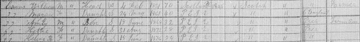 | Witness | Ambrose Cairns was enumerated on the census on 29 April 1891 in the household of William Wilson Cairns in Lot 17, Prince County, Prince Edward Island, CanadaG. included in the household with William (age 60) were his wife Helen Darby (age 54), their children Margaret (age 29), Benjamin (age 24), Ambrose (age 21), Esther (age 16) and Lucy (age 14). William was a farmer. The family religion was Presbyterian, except for Margaret who chose Church of England.5 1891 Canada Census, Lot 17, Prince County, Prince Edward Island. Household of William Wilson Cairns, his wife Georgiana Helen Darby, and their children Margaret, Benjamin, Ambrose, Esther and Lucy. |