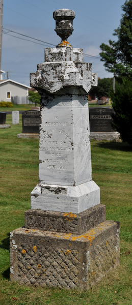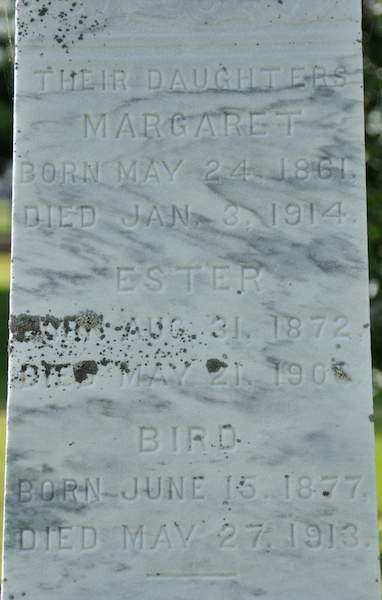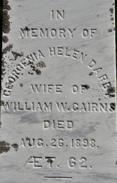 | Burial | She was buried in the Peoples Cemetery, Summerside, Prince County, Prince Edward Island, Canada, 46.40576, -63.77652G. Inscription: In / Memory of / Georgenia Helen Darby / Wife of / William W. Cairns / Died / Aug. 26, 1898, / AET. 62 / - / The precious to our hearts has gone / the voice we loved is stilled / the place made vacant in our home / can never more be filled / CAIRNS Left: Ambrose Cairns / Died / Jan. 9, 1902 / AET. 33 Right: William W. Cairns / Born Feb. 4, 1831 / Died / April 16, 1914 back: Their daughters / Margaret / Born May 24, 1861, / Died Jan. 3, 1914 / Esther / Born Aug. 31, 1872 / Died May 21, 1906 / Bird / Born June 15, 1877 / Died May 27, 1913.4 Tombstone, Georgiana/Georgenia/Georgina Helen Darby (1836-1898), her husband William W. Cairns (1831-1914), their son Ambrose (1868-1902), their daughters Margaret (1861-1914), Esther (1872-1906), Bird (1877-1913). Peoples Cemetery, Summerside, Prince County, Prince Edward Island, Canada.  Front inscription detail.  Left inscription detail.  Right inscription detail.  Back inscription detail. |